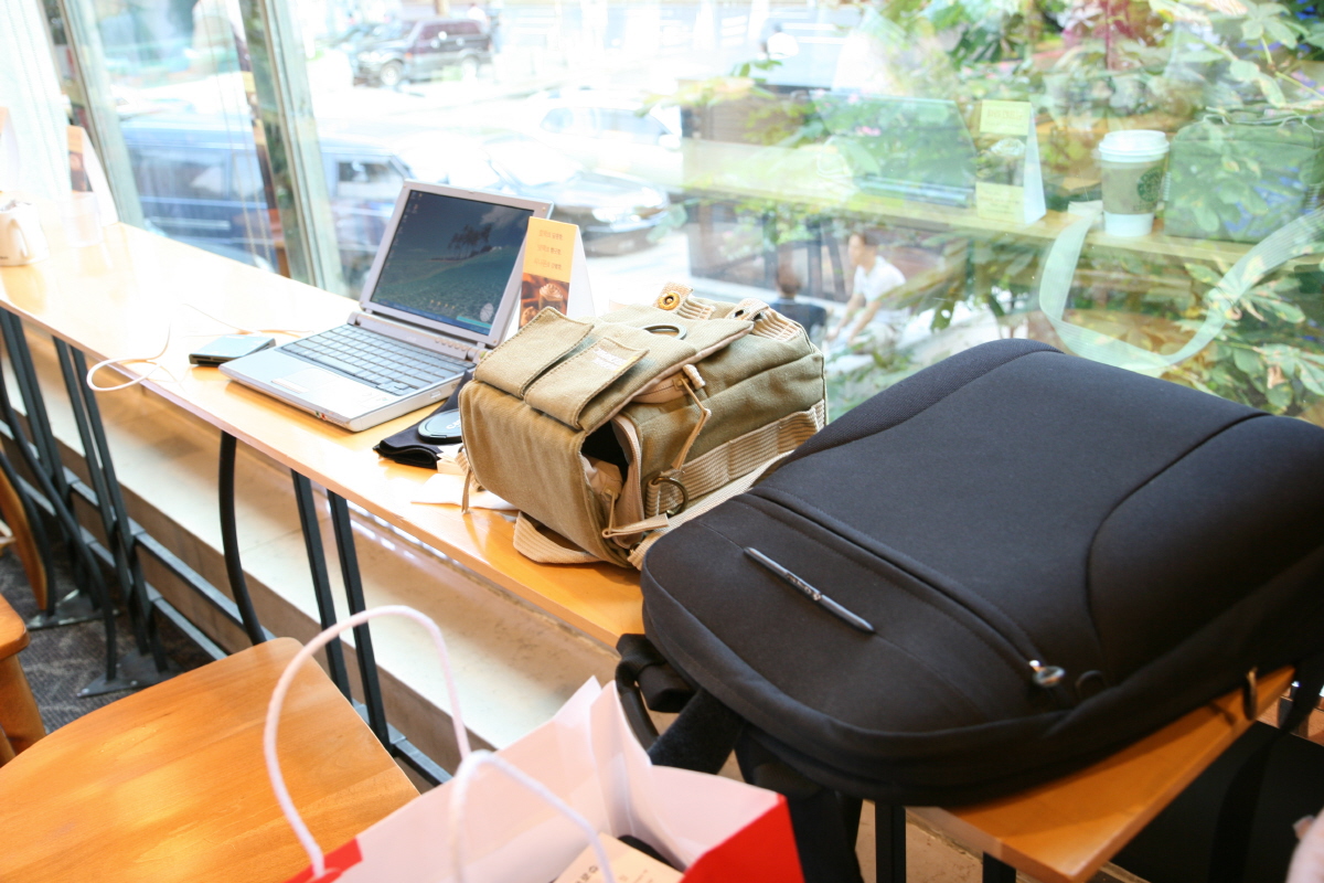 :오늘 내가 들고 다닌 장비들…. 왼쪽부터 바이오 노트북. 카메라 가방, 노트북 베낭 과 캬라멜 마끼아또 한잔…..^^