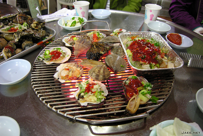 일요일 저녁 갑자기 Feel 을 받고 달려간 아산만 방조재 근처의 조개구이집. 왼쪽의 반쯤 나온 조개쟁반을 포함하야 3만원 어치..